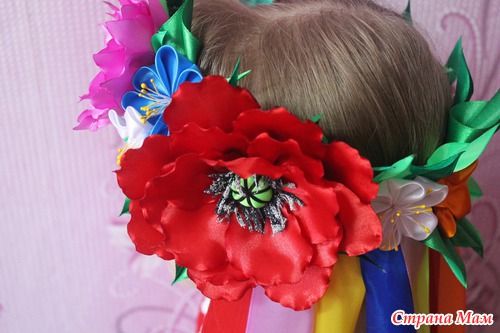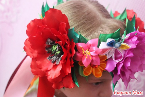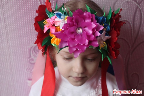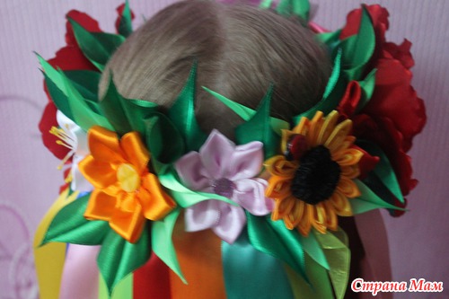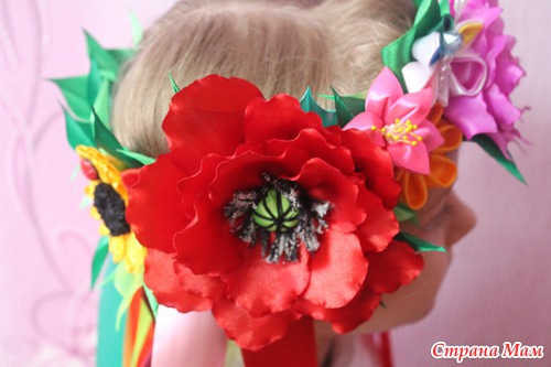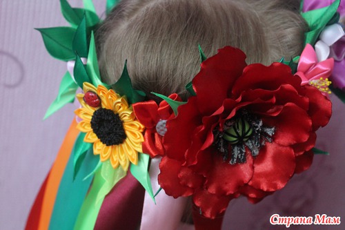 Очень уж мне этот венок нравился... Всё любовалась на наших рукодельниц-какая красота!!!... но думала -долго его делать да и незачем вроде... А тут вдруг дочери в школу на выступление понадобился, а у знакомых не нашли на прокат-вот пришлось в срочном порядке за 1 день и костюм сшить, и венок смастерить. Хорошо что 4 цветочка самые большие уже в запасе были-пришлось резинки от маков и подсолнуха оторвать-но зато результат порадовал!