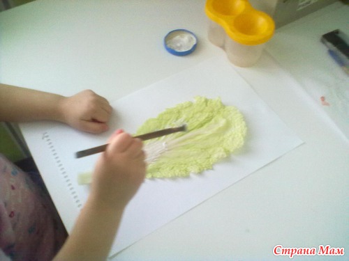 Затем, вместе с ребенком наносим кисточкой на лист капусты.