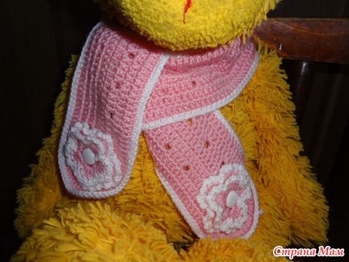 Шарфик вязала крючком из той же пряжи, что и верхняя шапочка. Ушел 1 моточек розового цвета и немного белого.