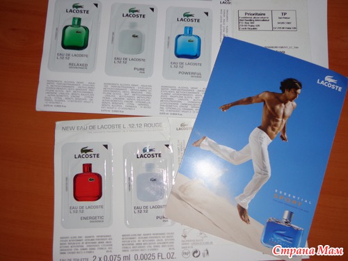 Www.fragrances.lacoste.com/RU/lacoste-eau-de-lacoste-for-woman-free-perfume-sample Нужно заполнить форму, выбрать какие образцы интересуют, но можно и все-их три. Обычно приходит открытка в почтовый ящик, на открытке образцы-пропитанная салфеточка.