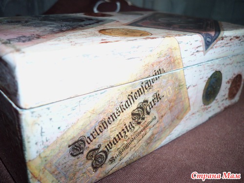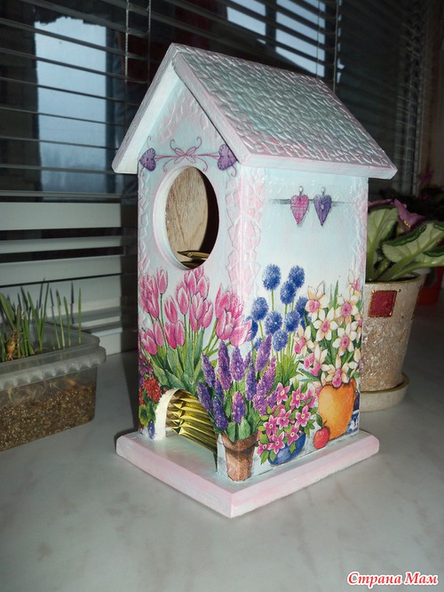 Вот такой домик мне папа смастерил, а купюрницу декупажила по готовой заготовке, пробовала для себя новые техники + двушаговый лак, затирала обычными тенями для век))