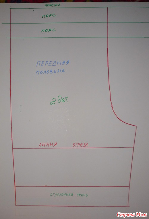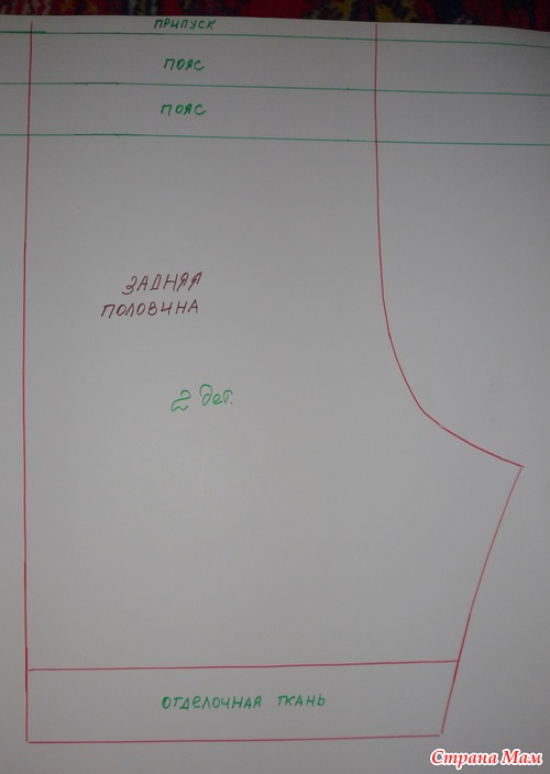 Еще один нюанс, который следует учесть, это припуски на швы. В разных журналах выкройки даются либо сразу с учетом припусков, либо без них. Это очень важное обстоятельство. В моем случае, припуски даются сразу. Поэтому по боковым швам я не закладываю припуски, но при разрезании выкройки в части передней половины (это красная линия) следует сделать пометку, что необходимо добавить 1,5 см на припуск.