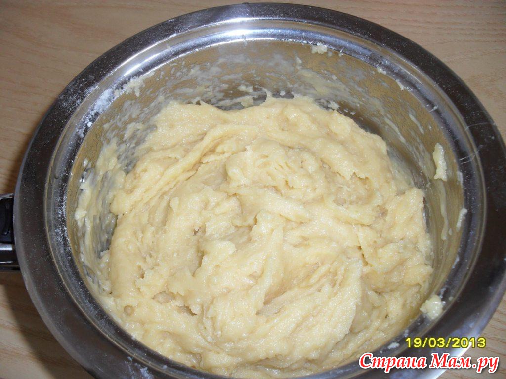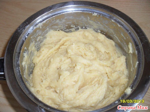 Приготовление: В кипящую воду добавляем масло, ждем полного растворения. Затем, постоянно помешивая, высыпаем муку. Перемешиваем до однородной массы. Даем остыть, и поочередно вмешиваем яйца. Одно "вмесили", потом второе и т. д. Проще делать миксером с винтовой насадкой. Получается вот такая масса