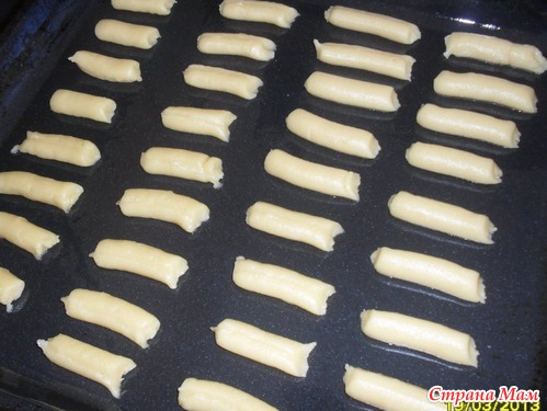 Эту массу перекладываем в кондитерский шприц, или мешок, или, если нет ни того ни другого, можно все выложить в пакетик (в нем же проделать небольшое отверстие 5мм), и выдавливаем небольшие полосочки прямо на противень, оставляя между ними место равное их ширине