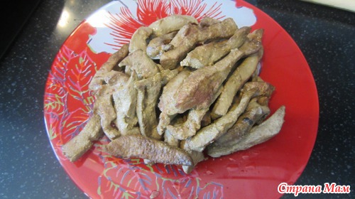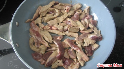 Печень порезать крупной соломкой, посолить и обжарить на сковороде