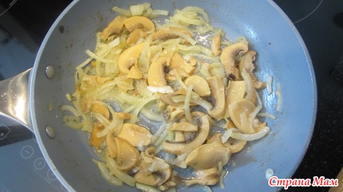 В этой же сковороде обжариваем лук с шампиньонами