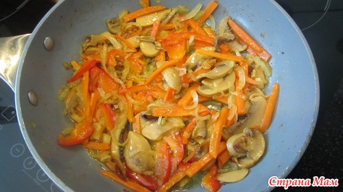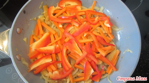 Как только лук станет золотистый добавить крупно порезанную соломкой морковь и перчик, обжаривать до полуготовности овощей