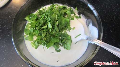 В миске смешать сливки (можно жидкую сметану) с зеленью