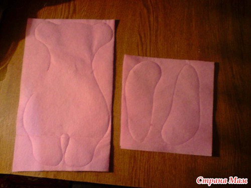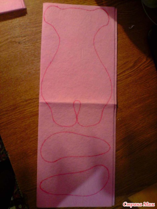 Подготовленную ткань складываем пополам и обрисовываем мишку.