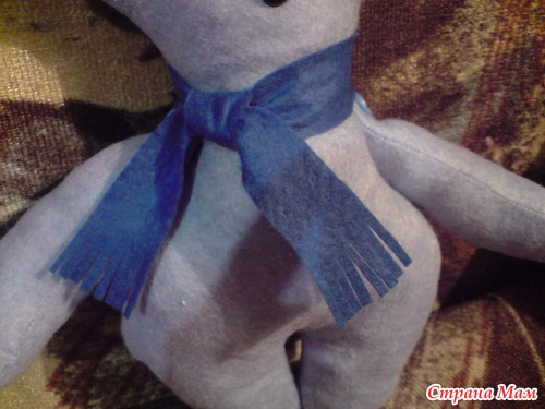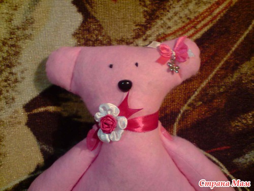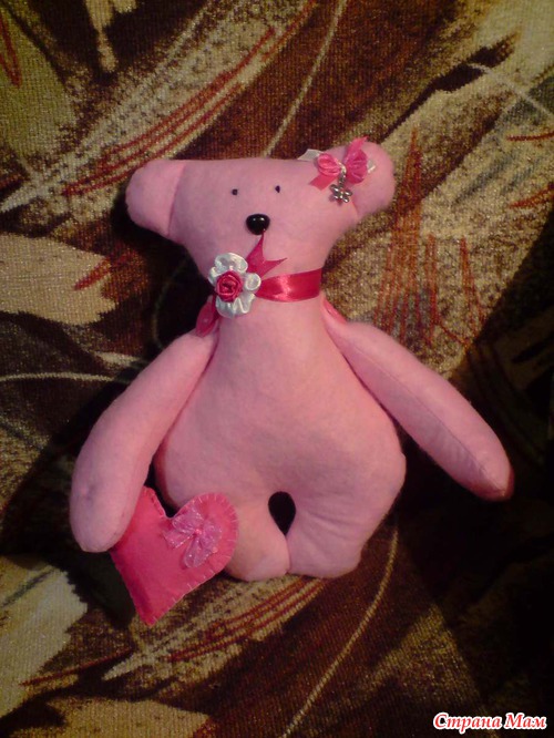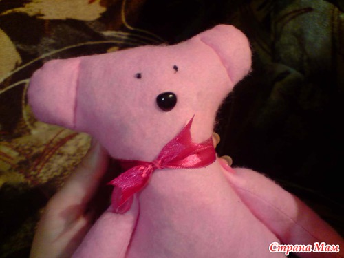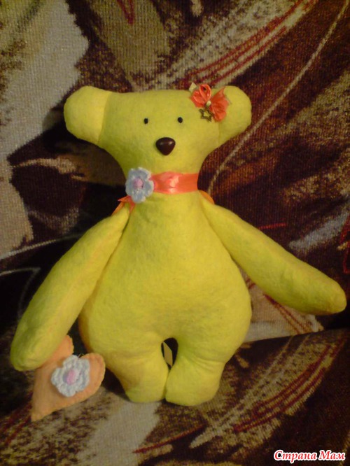а это мой мишутка, сшивала все сама руками, не используя машинку, глазки две бусинки, нос из ниток в стижках, сшился за три часа, пока сын спал....