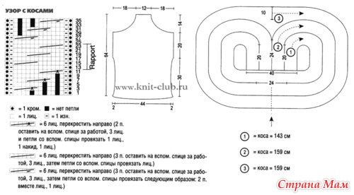 2- я и 3-я коса: набрать 13 п. и вязать узором с косами. Через 159 см от наборного края (после целого раппорта) все петли закрыть.