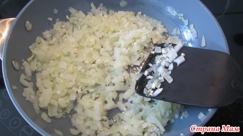 1-2 луковицы и 2 зубчика чеснока мелко порезать и обжарить на сковороде до мягкости