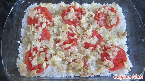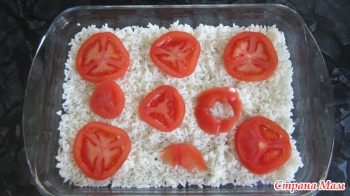 На помидоры выложить половину грибов, сверху оставшийся рис