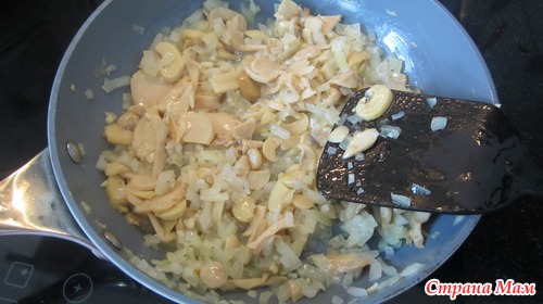 Добавить грибы грамм 300 и обжаривать приблизительно 5-8 минут