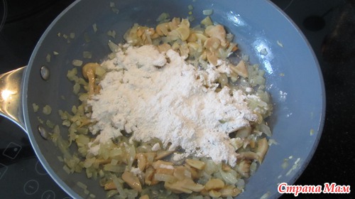 К оставшимся в сковороде грибам добавить 1-1,5 ст. ложки муки, обжарить 1 минутку