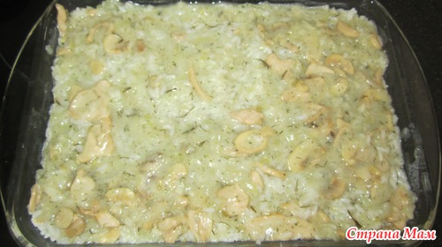 В форму для запекания выложить половину риса