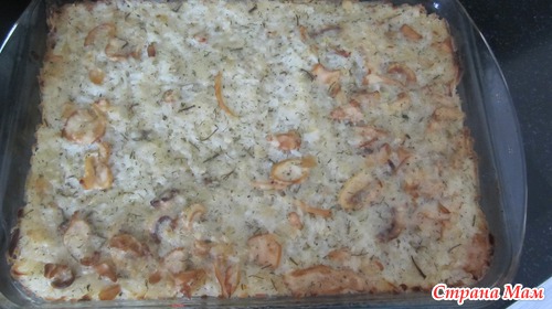 Полить рис соусом и запекать 30 минут при температуре 190 градусов