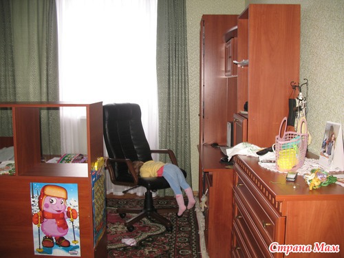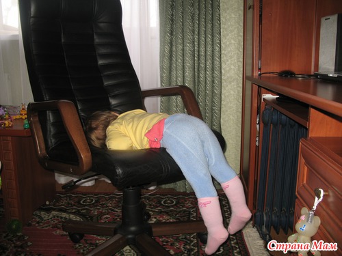 Отлучилась в кухню, возвращаюсь - дочь видать собиралась слазить с кресла (смотрела мульт за компом), но сон срубил, тело висело на кресло, от пола 10-15 см ))))