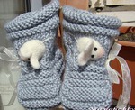Украсьте пинетки мышками, пришейте пуговку, выполните задний шов и проденьте ленту.