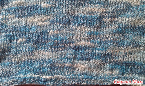 Ох и намучилась я с этими ниточками, мало того что плохо распутывались, да еще и в процессе вязания из клубка распадаются и запутываются. Действительно ниточка такая смотрится только в платочной или чулочной вязке, и то петельки пляшут, хотя я этим не страдаю. Думала после стирки встанут, но нет. Пробовала даже простейшие узоры с накидами тоже не понравилось и отделку пришлось сделать простым ст. б/н. Ну не смотрится эта ниточка в узорах. Вот сделала фото поближе.