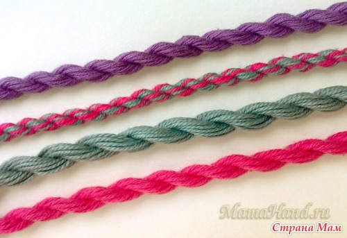 если взять нитки разных цветов, то витой шнур получается как бы меланжевый (на моем фото это серый с розовым)