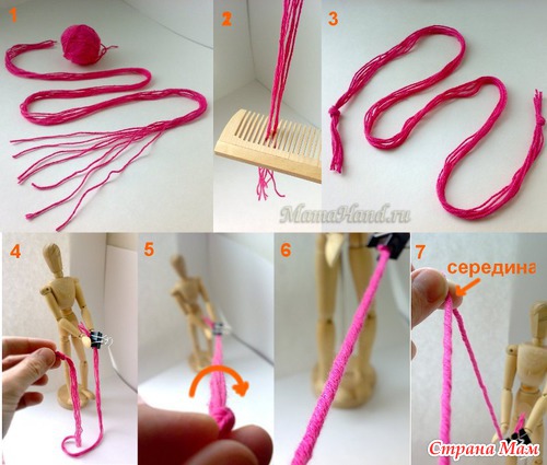 Чтобы шнурок из ниток был ровный и красивый, нитки нужно выровнять, например расческой (1, 2). На концах пучка ниток после выравнивания завяжем узелки (необязательно) (3).