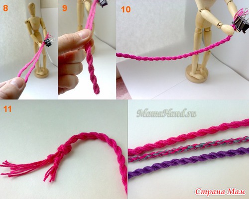 Конец шнура обязательно закрепляем узлом или перевязываем ниточкой (11), иначе он просто раскрутится обратно. И если нужно будет укоротить витой шнурок из ниток, не забудьте, перед тем как браться за ножницы, шнур закрепить от распускания.