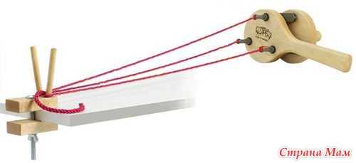 еще быстрее получается витой шнур с помощью такого интересного устройства: привязываешь нитки, крутишь ручку и получаешь готовый шнур нужной длины.