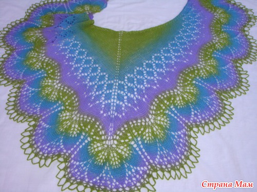 Добрый день всем! Ещё одна шаль по схеме одной из шалей Энгельна(схемы брала на Осинке). Впервые вязала из Кауни, результатом осталась очень довольна! Очень красиво смотрятся в готовом изделии казалось бы несочетаемые цвета. О шали:Кауни 8/2, спицы №3,5, длина шали-1,40, ширина-0,60.