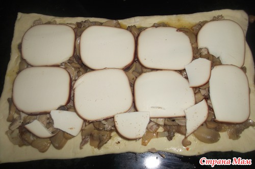 затем мне на глаза попался колбасный копченый сыр, который уже никто не хотел есть и он подсыхал в холодильнике, ааа была не была. Разрезала и на начинку сверху