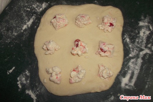 Раскатала пласт и сверху чайной ложкой начинку кучками (творог с вишней)