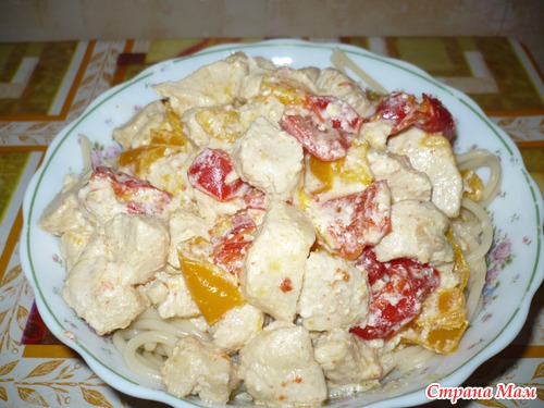 Для себя я автор этого блюда, но оно простое, возможно не я одна догодалась до этого. Курица со сливками это классика, а я добавила болгарский перец и мне очень понравилось это сочетание. Это блюдо я впервые приготовила года два назад и с тех пор готовлю постоянно. Сливок я добавляю побольше чтоб получилось что-то типа подливки. Нам очень нравится на гарнир спагетти. Ну, ближе к делу.