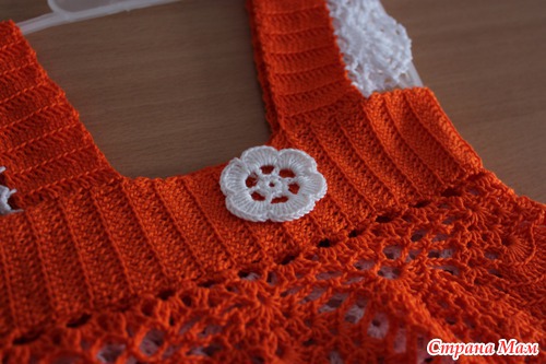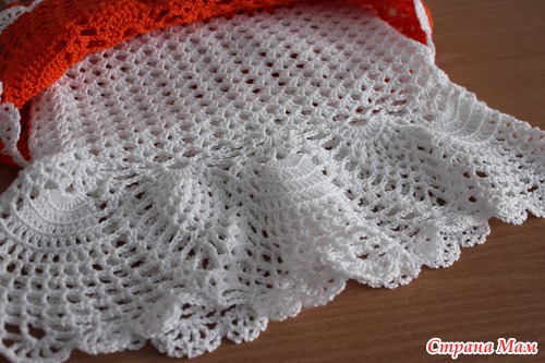 Пряжа любимая - Vita cotton Coco, ушло 2 мотка ( 1 белый и 1 оранжевый ), крючок №2.