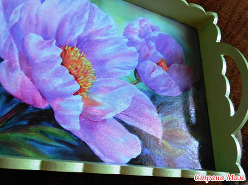 Сделала маме вот такой подносик в технике декупаж. Заготовка мдф, декупажная карта, акриловые краски, акриловый лак.