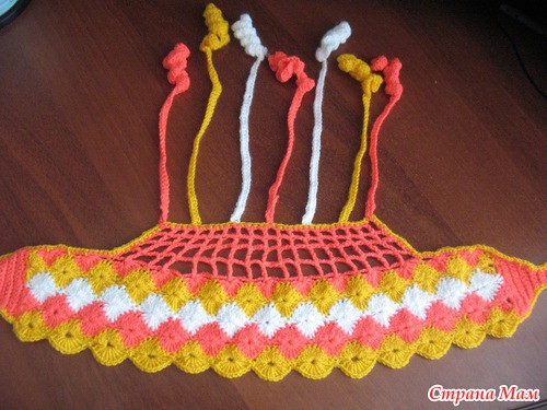 Здесь явно связано поворотными рядами: ряд в одну сторону, ряд в другую. По бокам розовой нитью перпендикулярно основному вязанию идут столбики без накида - тоже поворотными рядами с уменьшением количества столбиков по краям изделия. Сверху еще сетку прибабахали и обвязали все желтой ниткой. Как то так...
