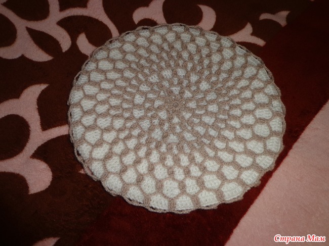 Сначала планировался просто белый берет ССН (пряжа Супер Мерино 300м\100г крючок №3), пока вязала блинчик, обдумывала отделку, и тут осенило меня связать из тоненькой пряжи другого цвета еще один беретик. Перекопав инет и свои бумажные запасы, остановилась на сеточке (пряжа неопознанная, по-моему, Меджик, крючок №2). Схемку вязяла простейшую из старого журнала, если интересно, попозже сфотографирую и выложу. Вот такой беретик получился у меня, можно сказать авторская работа.