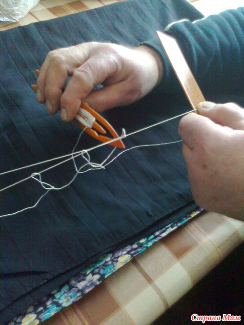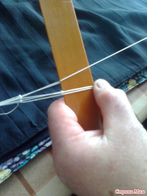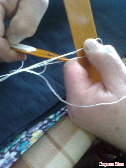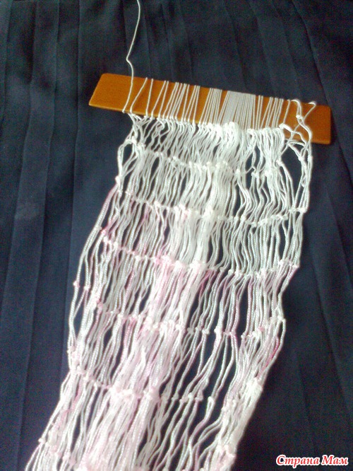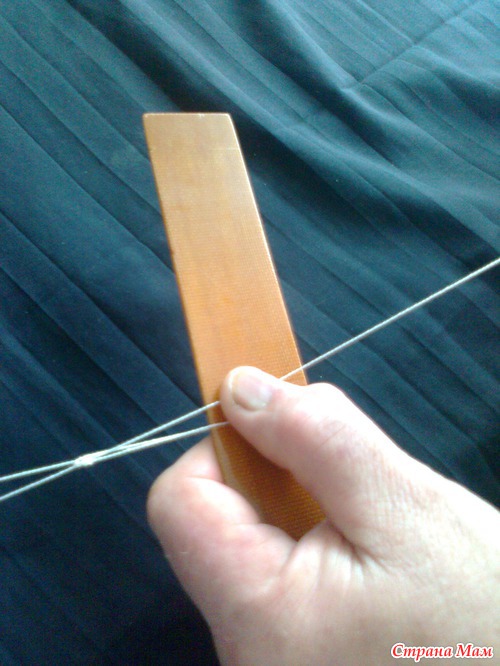 Подставляем планку под рабочую нить. Расстояние от узелка приблизительно равно ширине планки. Начинаем набирать первый ряд ячеек.