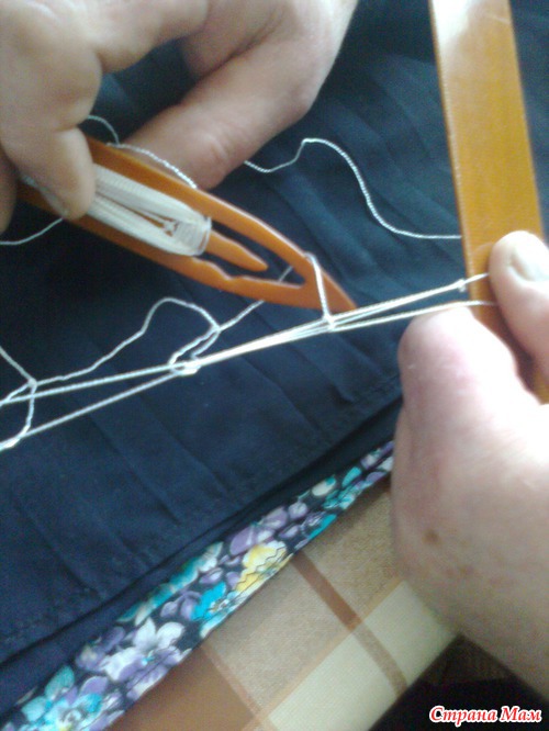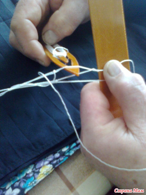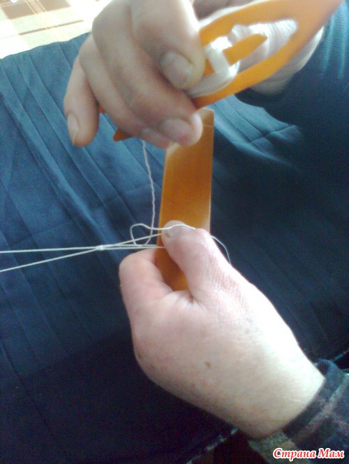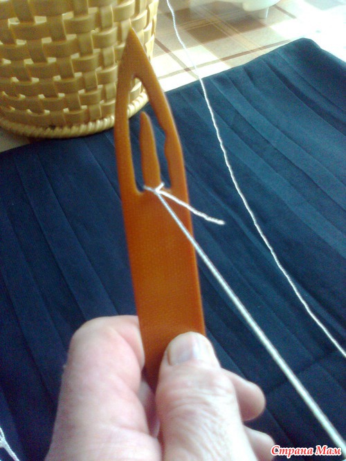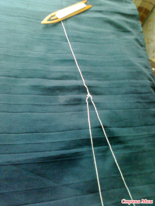К большой петле привязать конец нити с челнока. Не туго. чтобы узелок свободно скользил.
