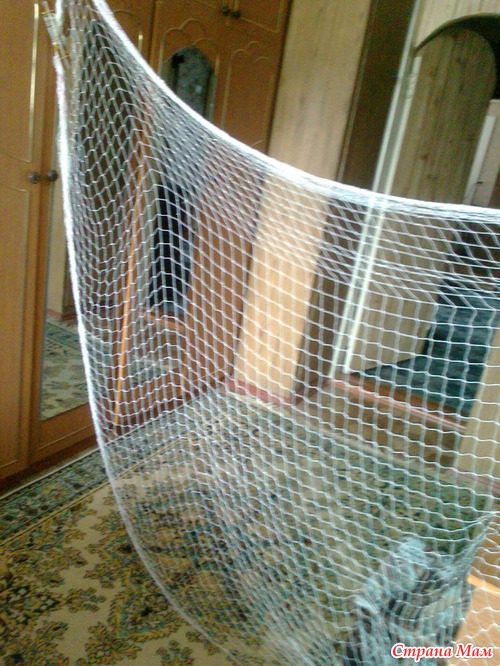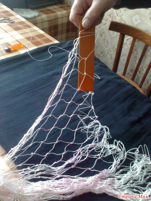 Сеть связана из капроновой (полиамидной) нити. Сеть вяжет муж, а комментарии мои.