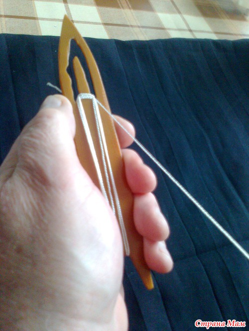 Нить наматывается так: цепляем за язычок, опускаем нить вниз, заводим между ножек челнока. Поворачиваем челнок и поднимаем нить вверх. Накидываем на язычок и повторяем процесс. Получается такая своеобразная восьмёрка.