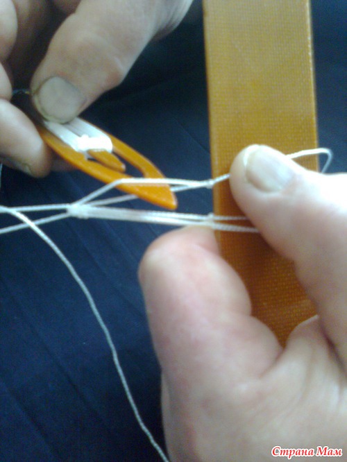 Делаем нитью круг поверх левой руки (нить под планку не заводить!!!). Заводим челнок под ДВЕ крайние нити перед планкой и подтягиваем образовавшийся узел на себя (завязываем узел).