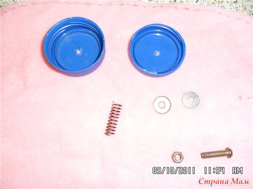 Только вместо бутылочных крышек, я взяла полиэтиленовые крышки для банки. Вырезала круги по размеру. С помощью нагретого гвоздика проделала отверстие. Осталось дело техники.