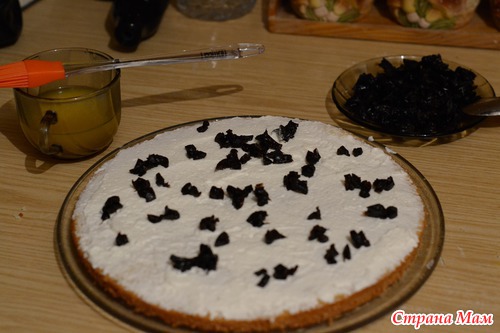 крем: я взбила сливки 35% 500мл с 3 ст. л. сахарной пудры. Но можно использовать и сметану с сахаром( 300мл\150г) или же заварной(каким вы пользуетесь обычно). И 300-400г чернослива, запарить кипятком, промыть, сцедить хорошо, мелко порезать и можно сразу смешать с кремом.