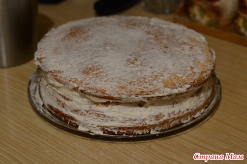 Так сложила все коржи, пропитала и промазала. Бисквит сам по себе очень нежный, так что пропитывать аккуратно надо.