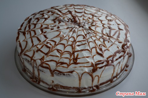 Выравнивать края сливками или кремом. Посыпать крошкой или потертой шоколадкой, я сварила шоколад и нанесла такой узор, не совсем ровно получилось, извиняюсь)))