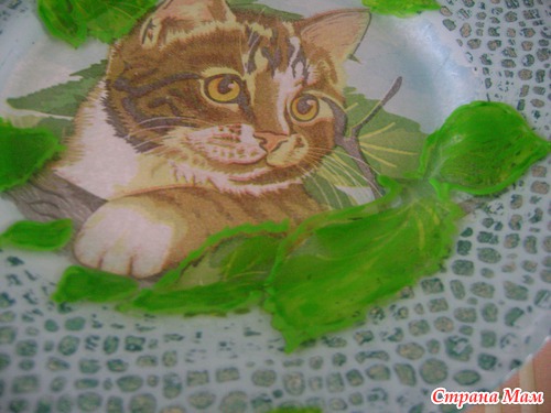 Теперь спешу показать, что у меня получилось. Итак, по совету Зиночки http://ozigoga.stranamam.ru/ наждачкой сняла слои лака и голубой краски. И сверху прошлась изумрудной краской. А также, как и советовали большинство девочек, добавила зелени: листья нарисовала зеленым контуром и покрыла красками по стеклу и керамике.