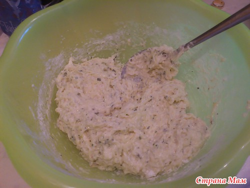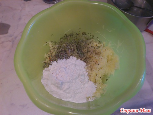 Добавляем муку, специи и немного картофельного отвара (это в идеале, можно просто теплой водички, примерно грамм 50)