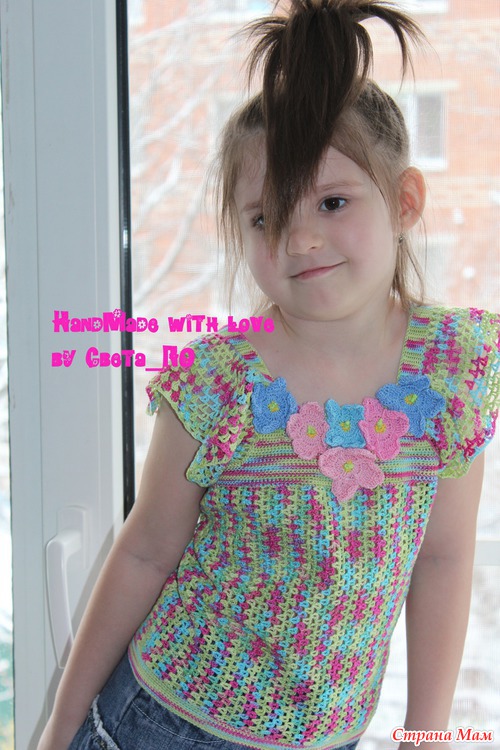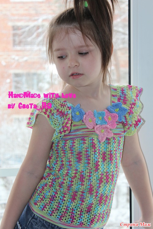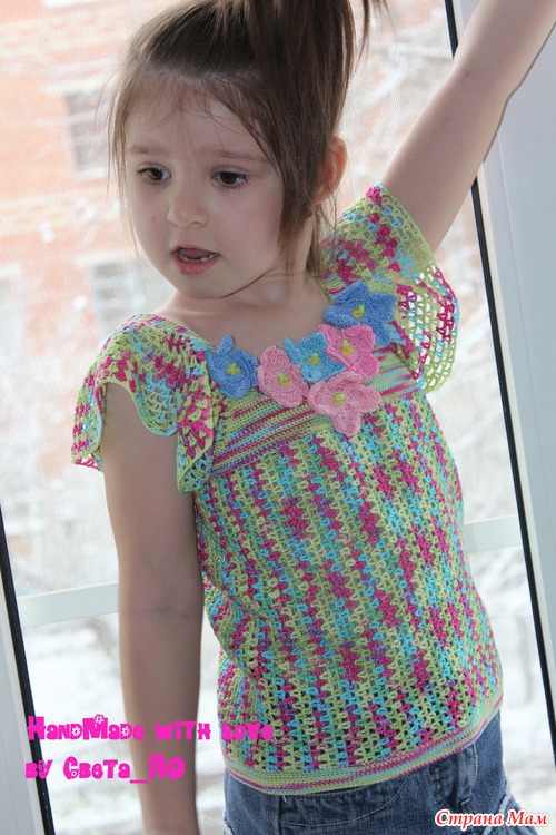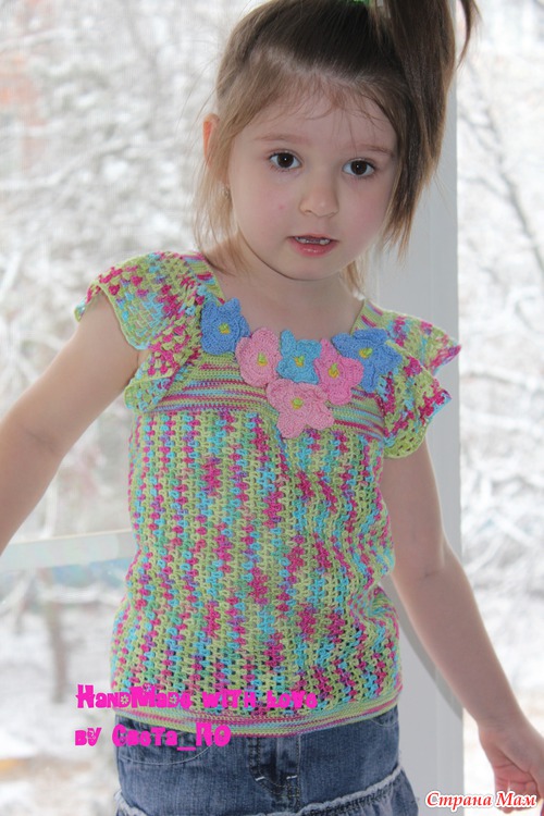 вязание НЕ по кругу - а просто прямоугольник - сзади он застегивается на пуговицы.... никаких прибавок-убавок.... но при ВТО немного растянула нижний край..... сверху и снизу СбН, потом СбН планки для пуговиц. и бретельки СбН, а потом "крылышки" набрать по бретелькам так: СсН,ВП,СсН - и все это не через 2 петли, как при вязке полотна, а через Одну - чтоб "рюшкой" было, а еще через три ряда и между "галочками" добавляется по ВП - тогда "крылышки" пышные получаются.... - ну это я так делала... - тут кому-как удобно....