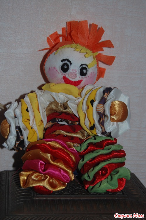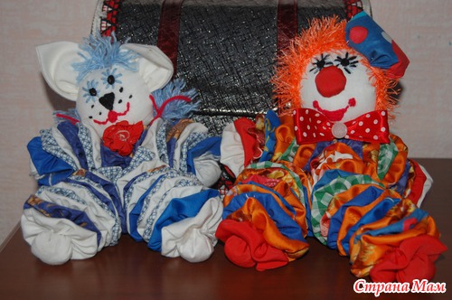 Клоуны сшиты в технике Йо-Йо. Мне эта техника ООООчень нравится, потому что в ход идут все клочки и клочёчки материала. Разного. Делаются вот такие (Пельмешки) потом сшиваются и получается вот такой клоун.. В принципе, можно много игрушек сделать в такой технике.