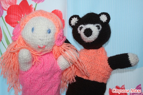 Решила сделать дочке куколок перчаточных. Схем конкретных нигде не нашла, поэтому собрала отовсюду понемногу и связались у меня Машенька и Медведь: